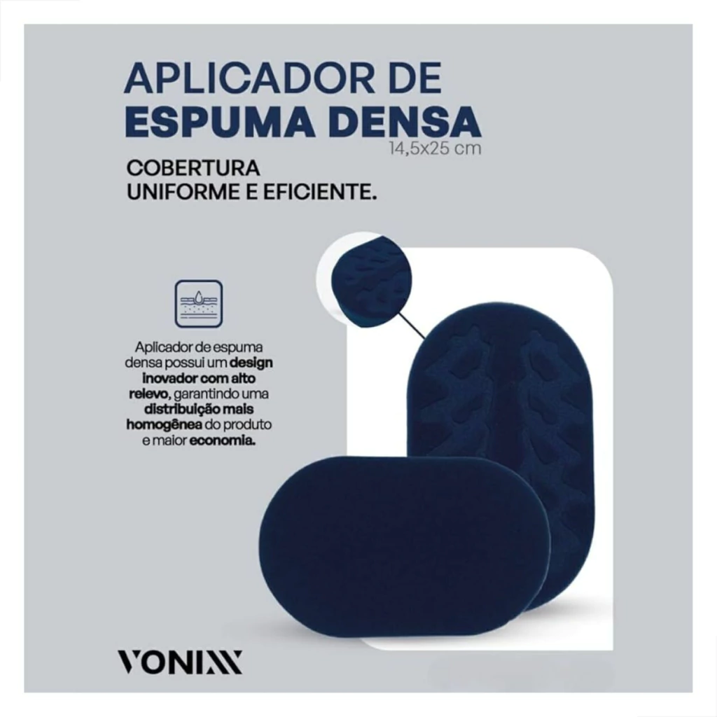 O APLICADOR DE ESPUMA DENSA espalha o produto de maneira mais uniforme e eficiente. O aplicador possui textura em alto relevo que espalham melhor o produto proporcionando maior eficiência durante a aplicação.