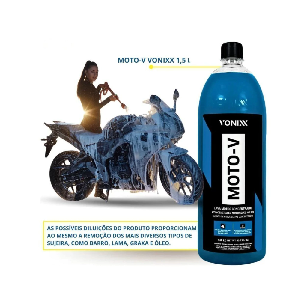 MOTO-V é um lava-motos, desenvolvido para limpeza de alta eficiência. Sua formulação equilibrada permite uso, sem agredir, em todas as partes da motocicleta, seja motor, pintura, metais ou plásticos. As possíveis diluições do produto proporcionam ao mesmo a remoção dos mais diversos tipos de sujeira, como barro, lama, graxa e óleo.