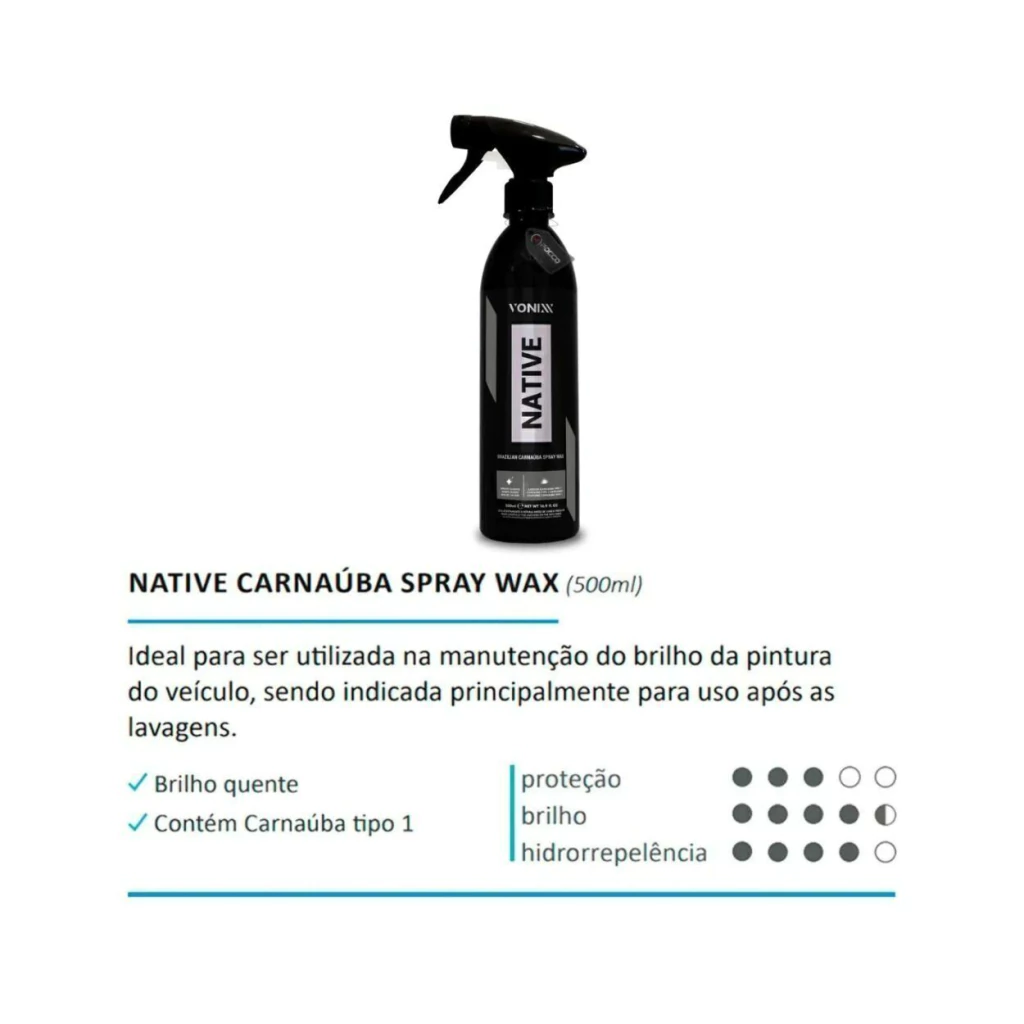A Native Brazilian Carnaúba Spray Wax foi desenvolvida com a mais pura cera de carnaúba amarela do tipo 1 cearense e produzida 100% no Brasil. É ideal para ser utilizada na manutenção do brilho da pintura do veículo, sendo indicada principalmente para uso após as lavagens.