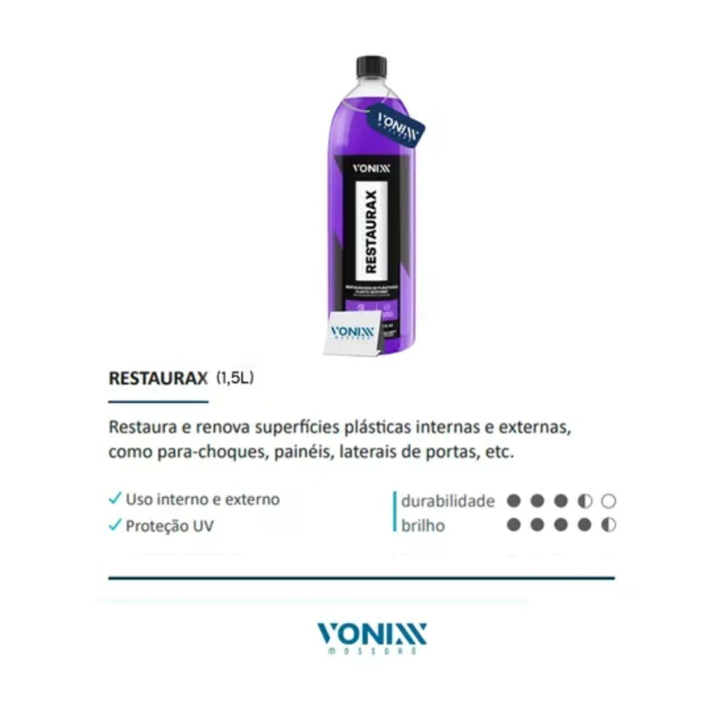 Restaurax renova e restaura superfícies plásticas, como para-choques, painés e laterais de portas. Sua fórmula contém polímeros especiais que também protegem as peças contra as ações do tempo, evitando degradação prococe do material