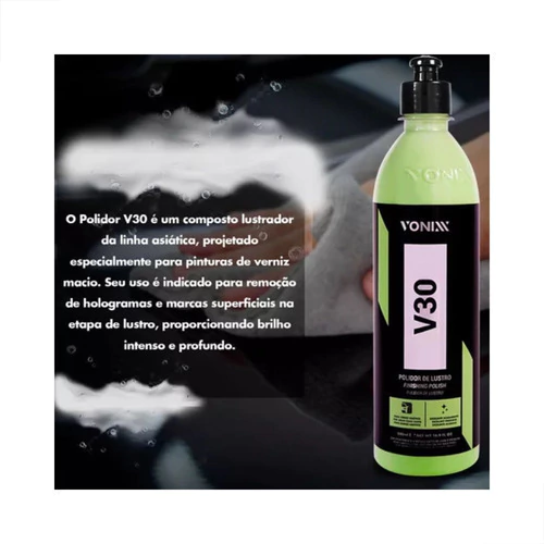 O Polidor V30 é um composto lustrador da linha asiática, projetado especialmente para pinturas de verniz macio. Seu uso é indicado para remoção de hologramas e marcas superficiais na etapa de lustro, proporcionando brilho intenso e profundo.