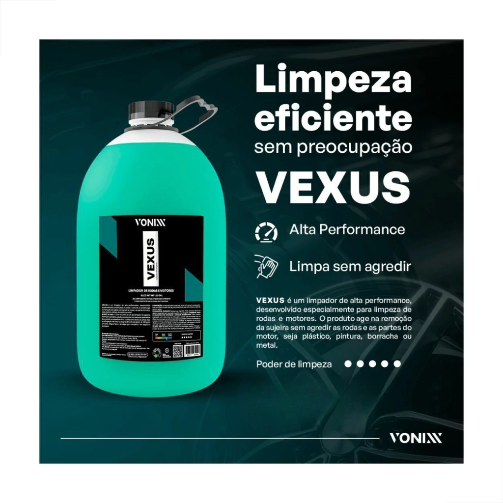 VEXUS é um limpador de alta performance, desenvolvido especialmente para limpeza de rodas e motores. O produto age na remoção da sujeira sem agredir as rodas e as partes do motor, seja plástico, pintura, borracha ou metal.